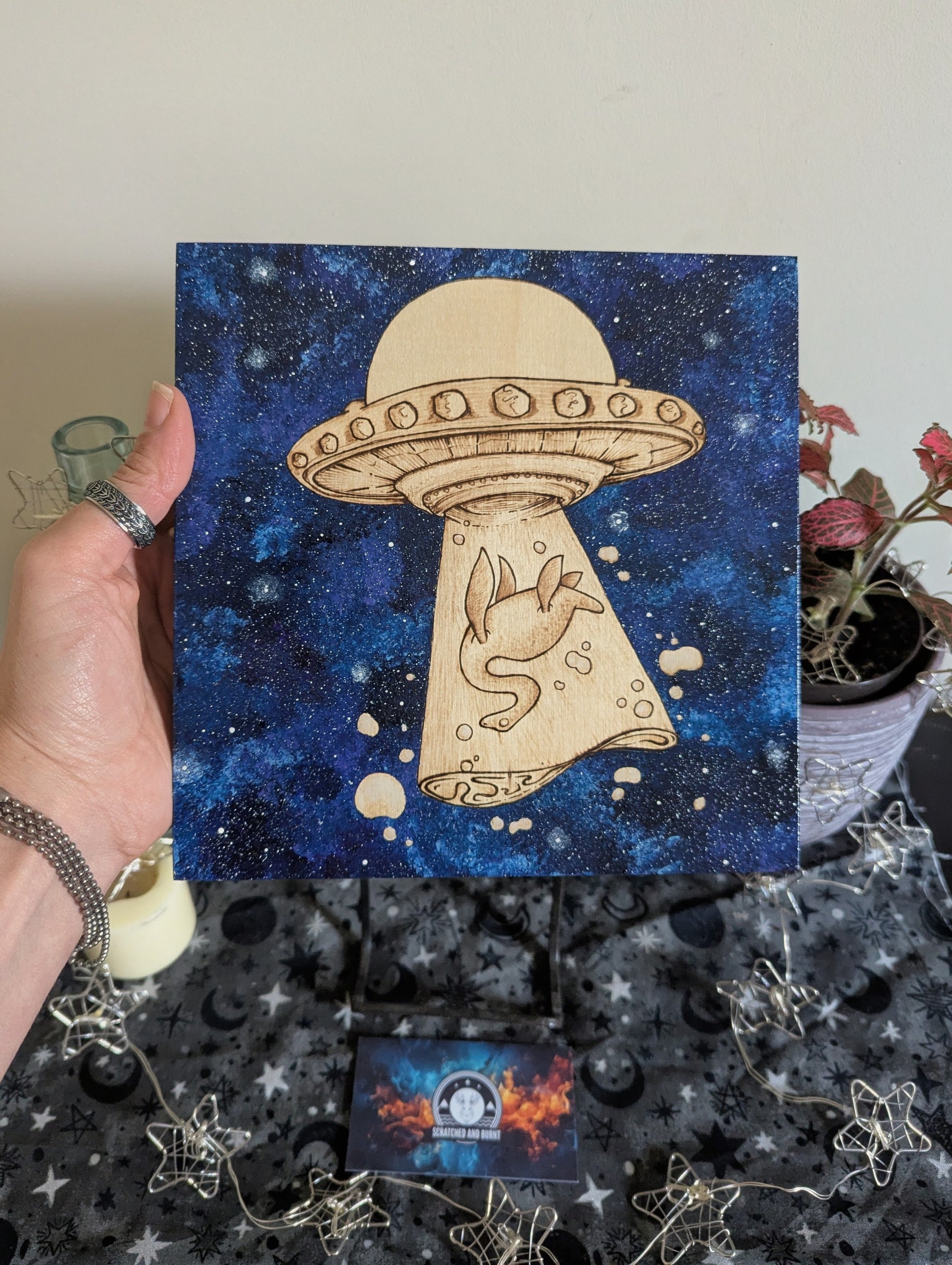 Alien Abduction, Loch Ness Monster! Pyrography w/ Acrylics, Desk/Wall Art