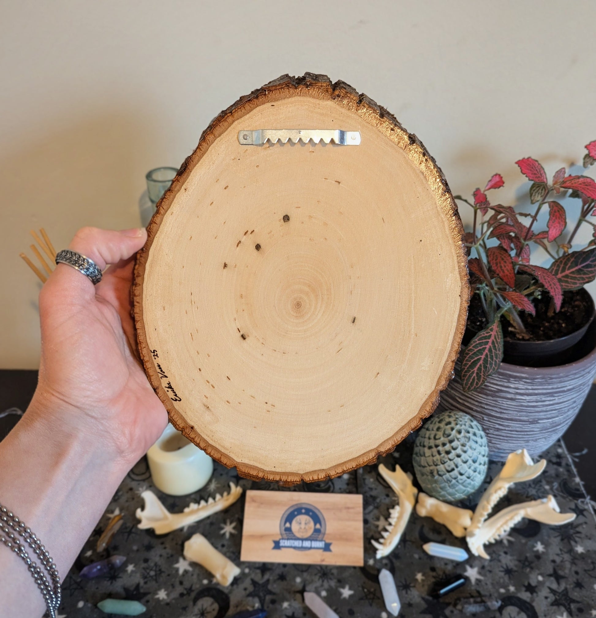 This captivating piece showcases a majestic dragon in flight, hand burned in a slice of basswood, against a canvas painted with the enchanting colors of an acrylic starry night sky.