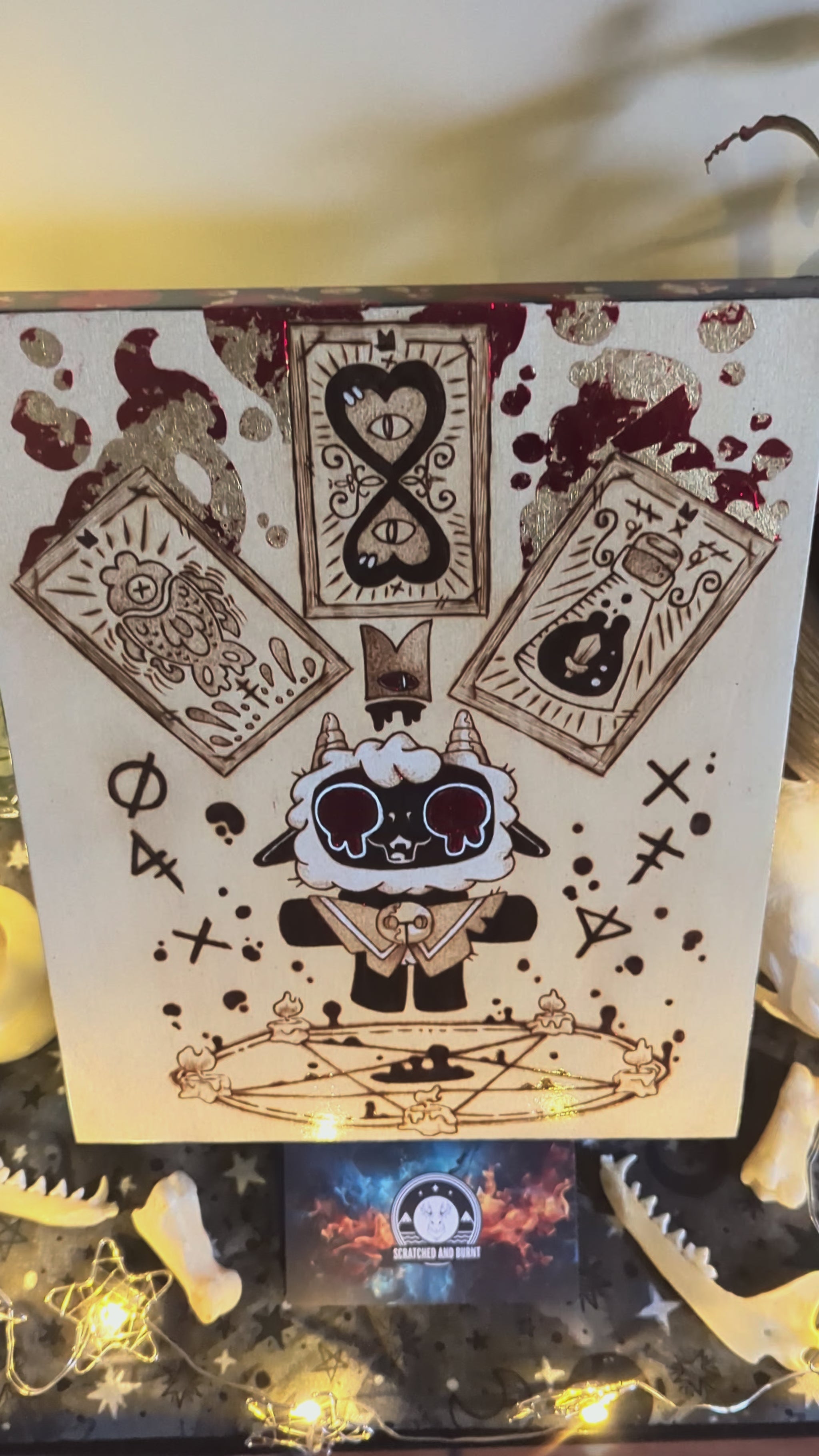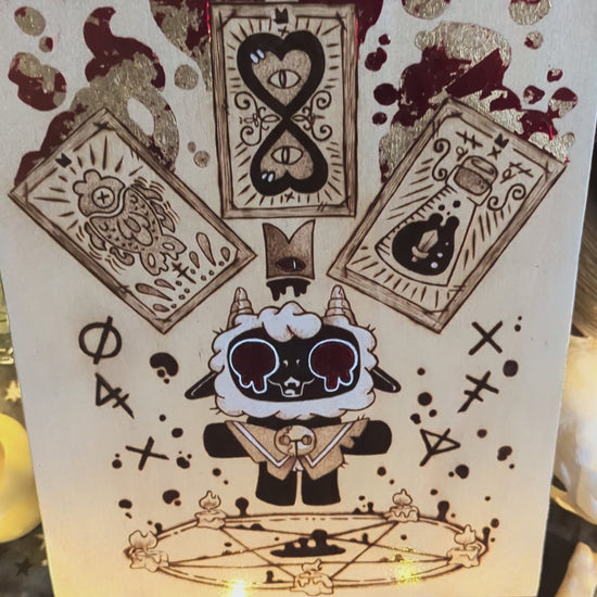 Inspired by the delightfully dark world of Cult of the Lamb, this hand-burned artwork features Lambert, the adorable yet ominous cult leader, surrounded by the game’s mystical tarot cards. Every detail is carefully burned into the wood, capturing the eerie charm of the game’s occult aesthetic.