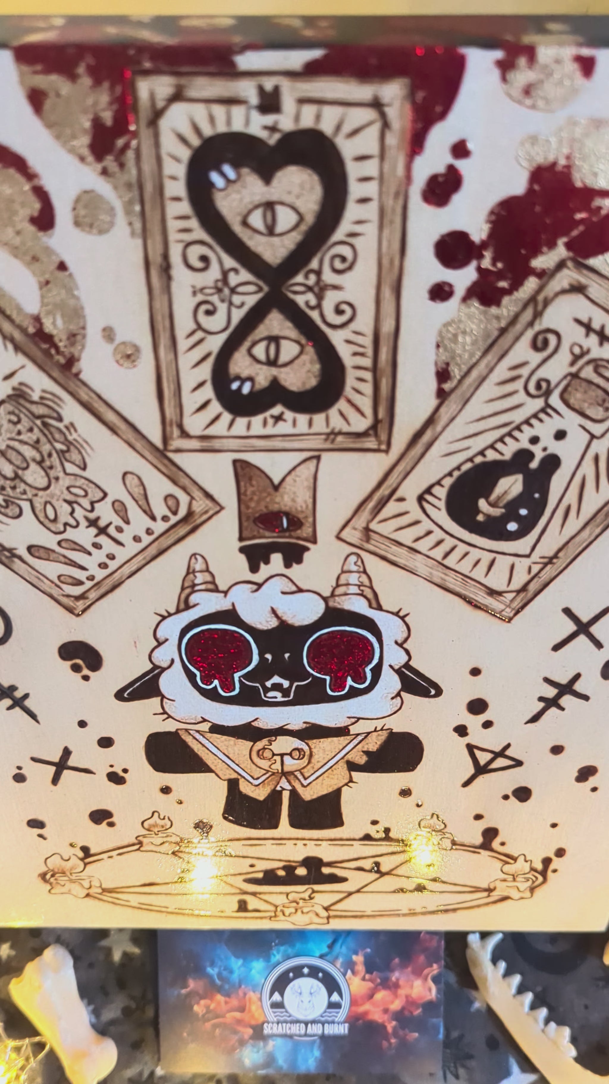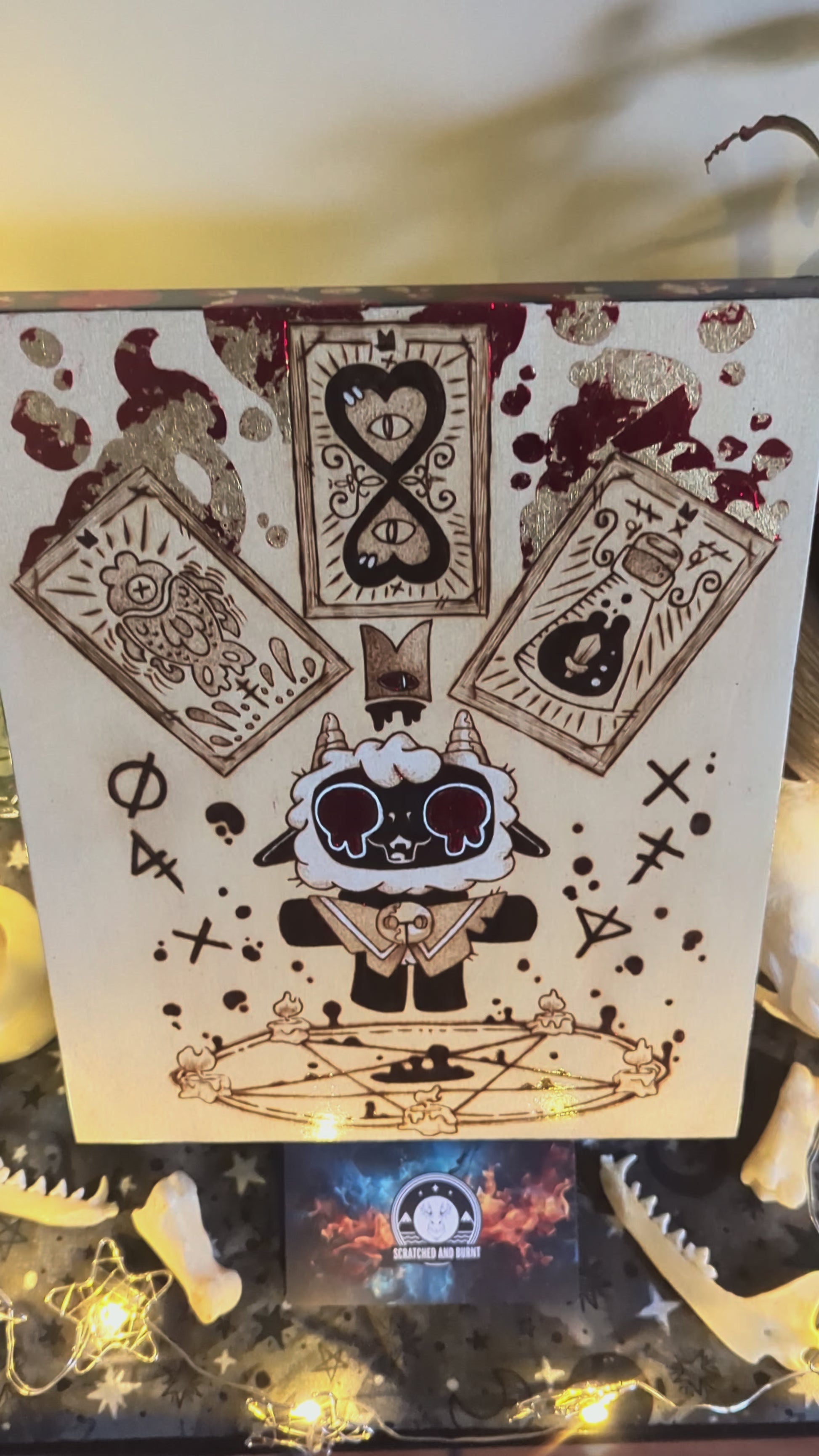 'Cult of the Lamb' Theme Pyrography with Colored Foil Accents, on Wood