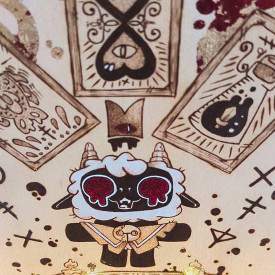 Accented with shimmering colored foil, this piece brings a touch of divine radiance to the otherwise shadowy theme, making it a perfect blend of the macabre and the mesmerizing. Whether you’re a devoted follower of the game or simply drawn to its unique mix of cute and creepy, this artwork is a tribute to fate, fortune, and the power of belief.