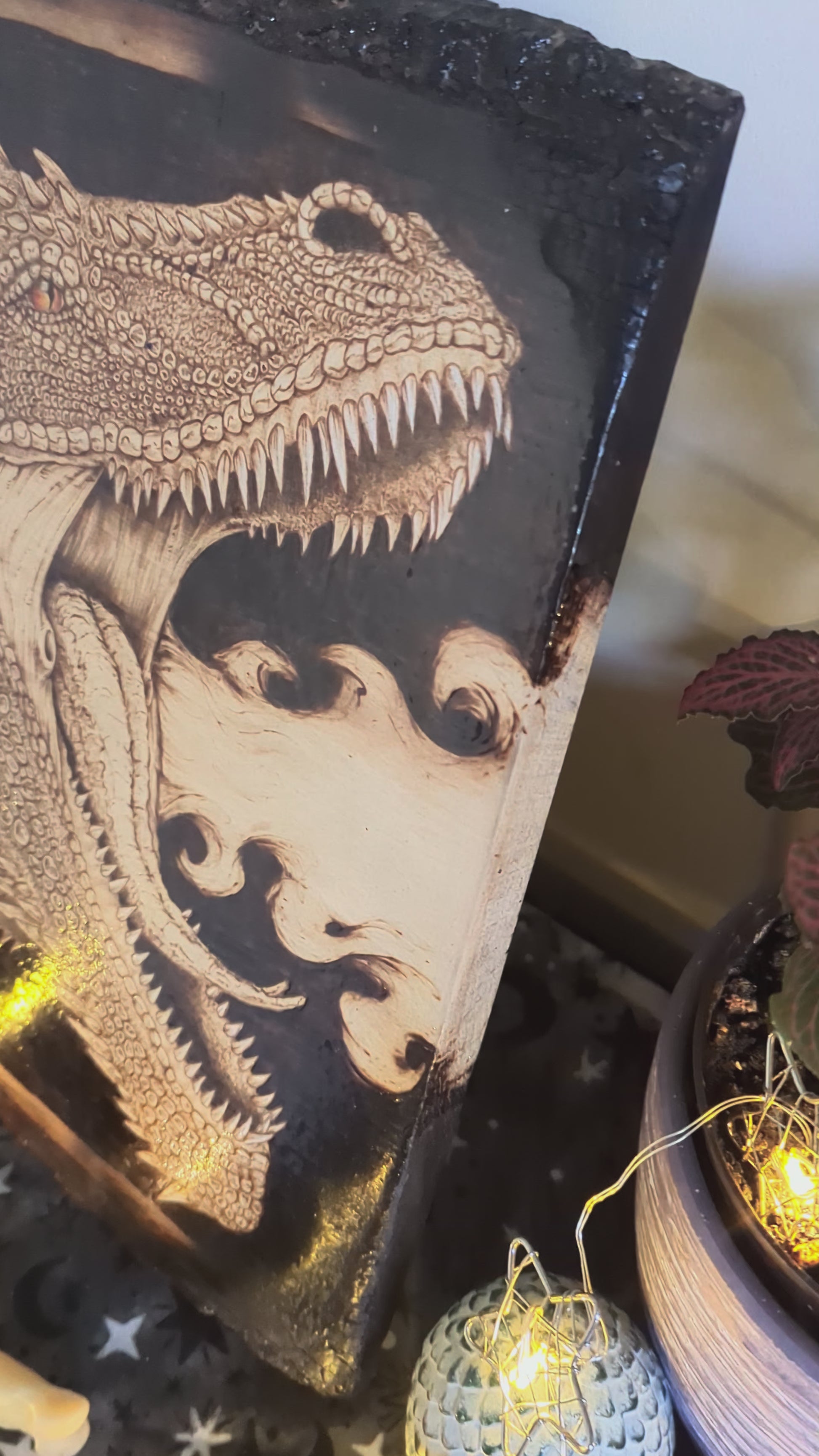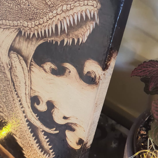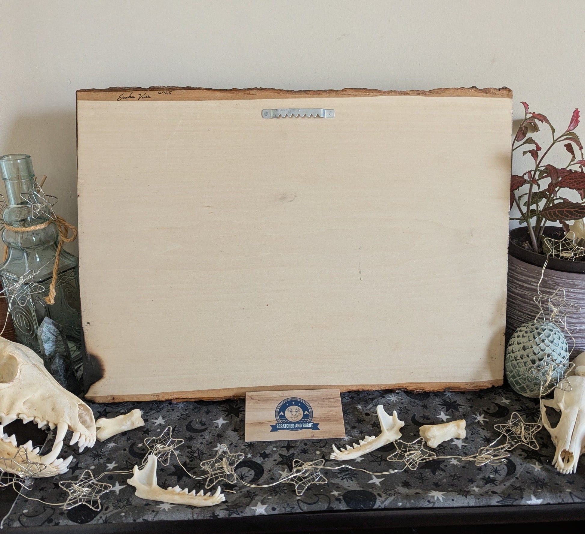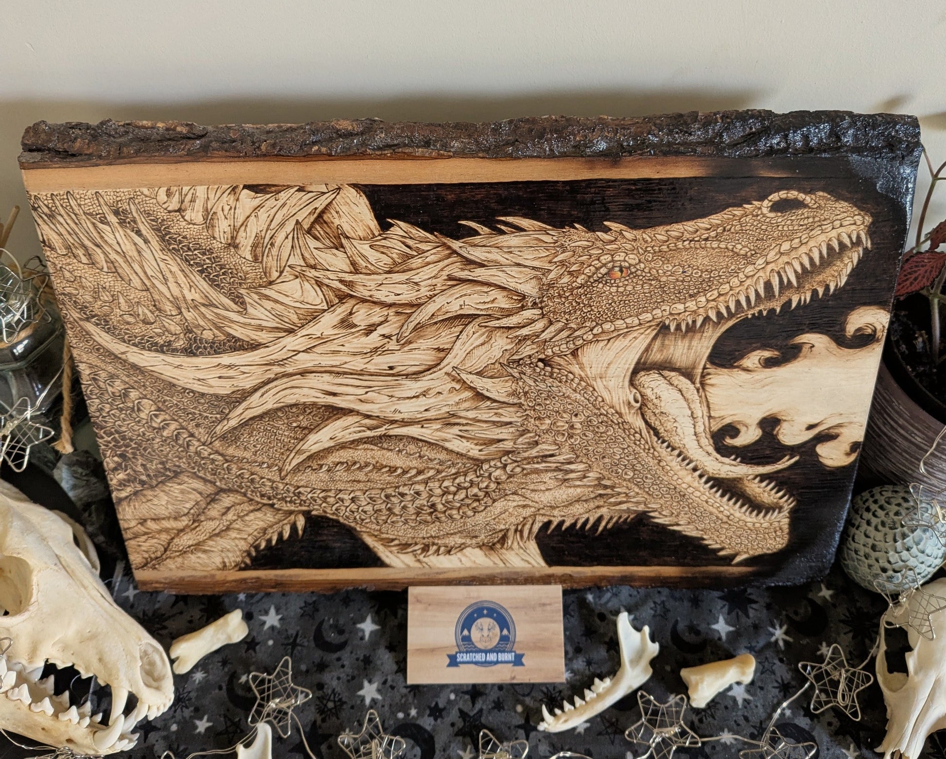 A dragon this fierce deserves more than just paint — it deserves to be burned into being. Every line of this pyrography piece was hand-drawn with heat, creating layers of detail across its scales and teeth. The edge has been lightly torched to give it that battle-scorched look, and a pop of fiery color in the eye gives a sense of life behind the flame.