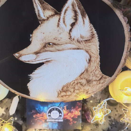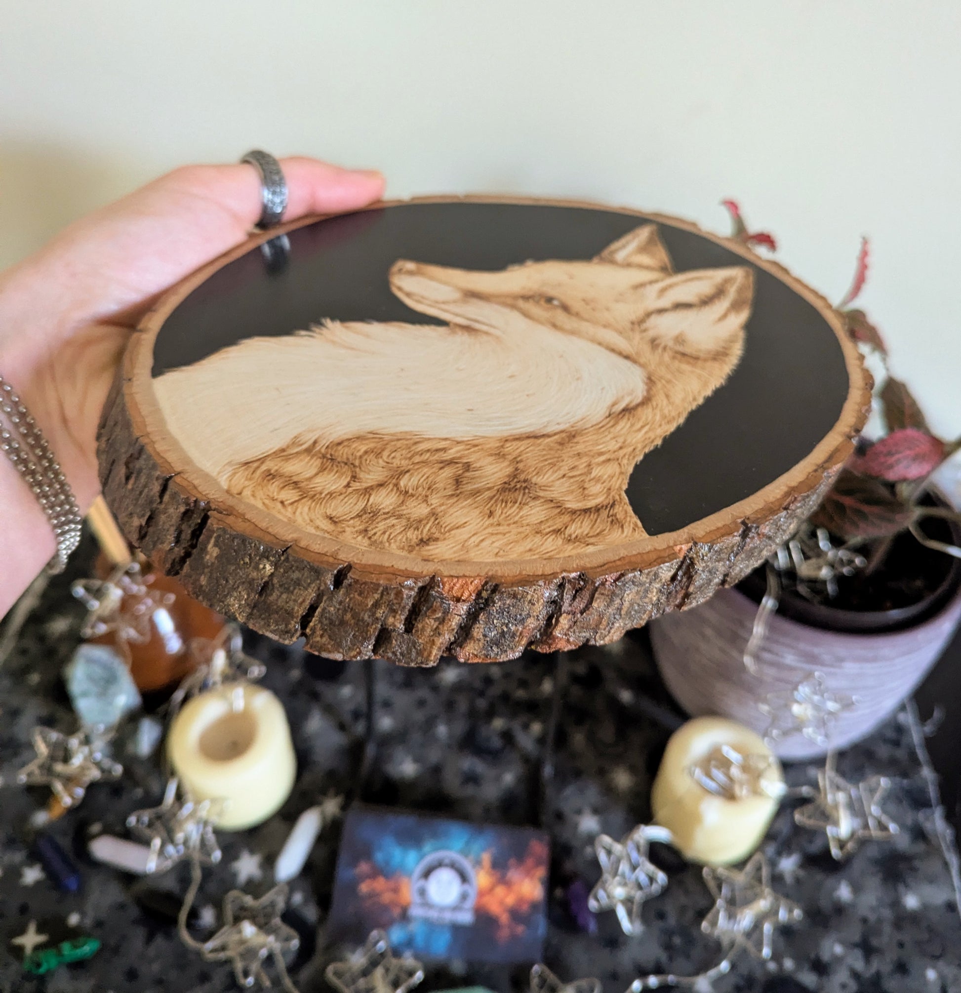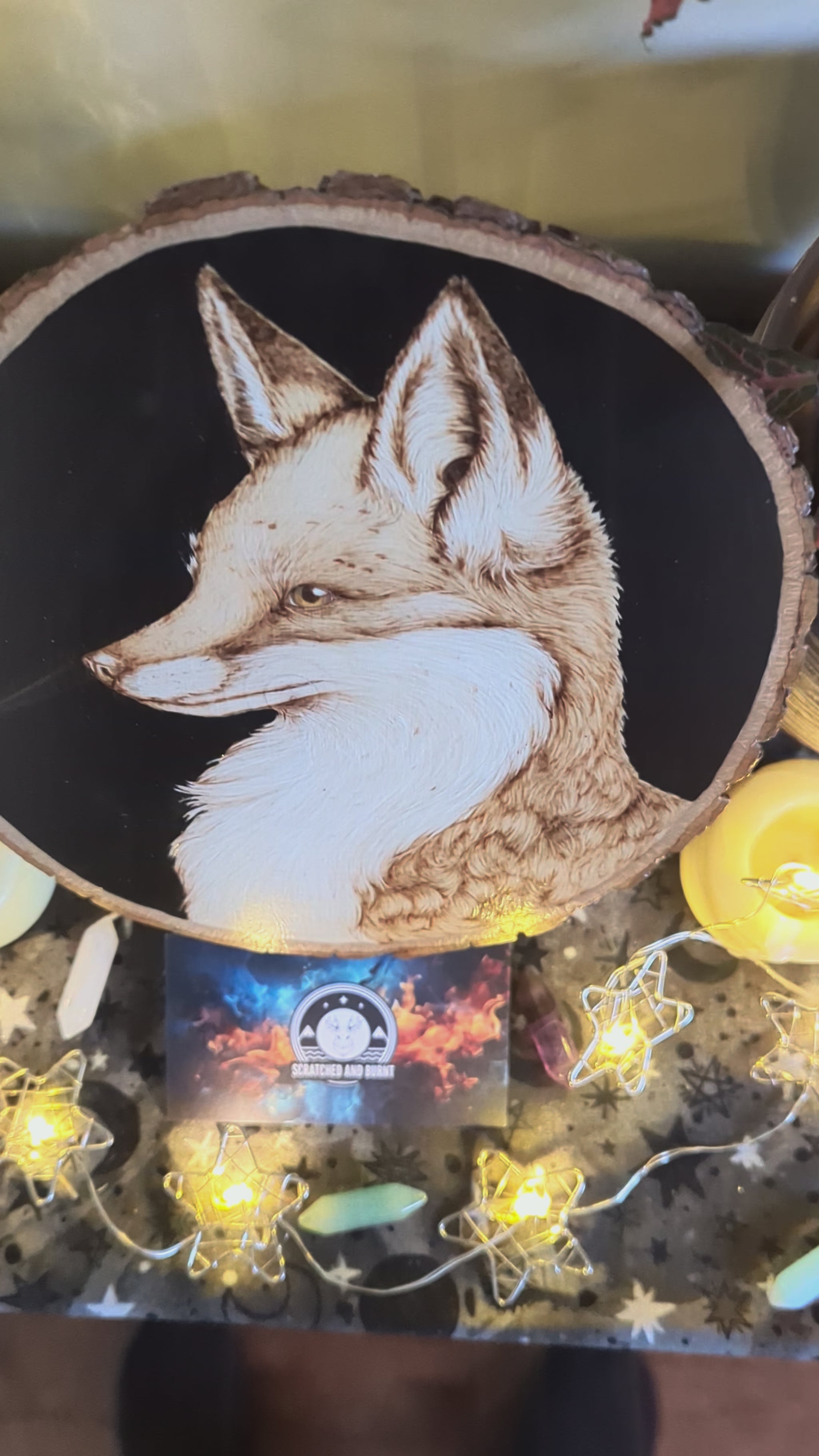 A hand-burned portrait of a fox — detailed, fluffy, and full of quiet charm. The dark background makes the fur pop, giving this piece a warm, lifelike depth that captures the fox’s curious spirit.