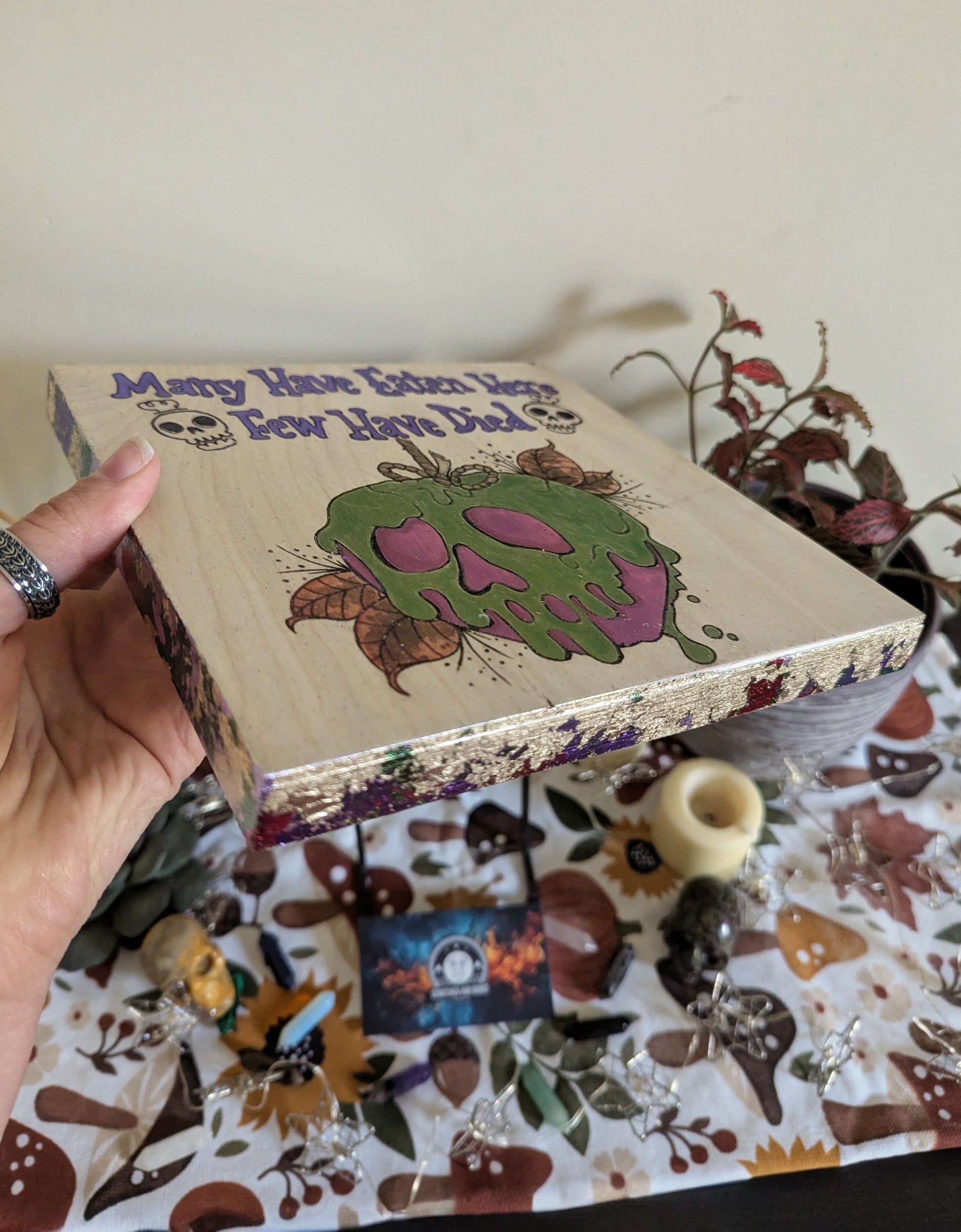Many Have Eaten Here, Few Have Died w/ Poison Apple, Pyrography with Watercolors, on Wood, Wall/ Desk Art