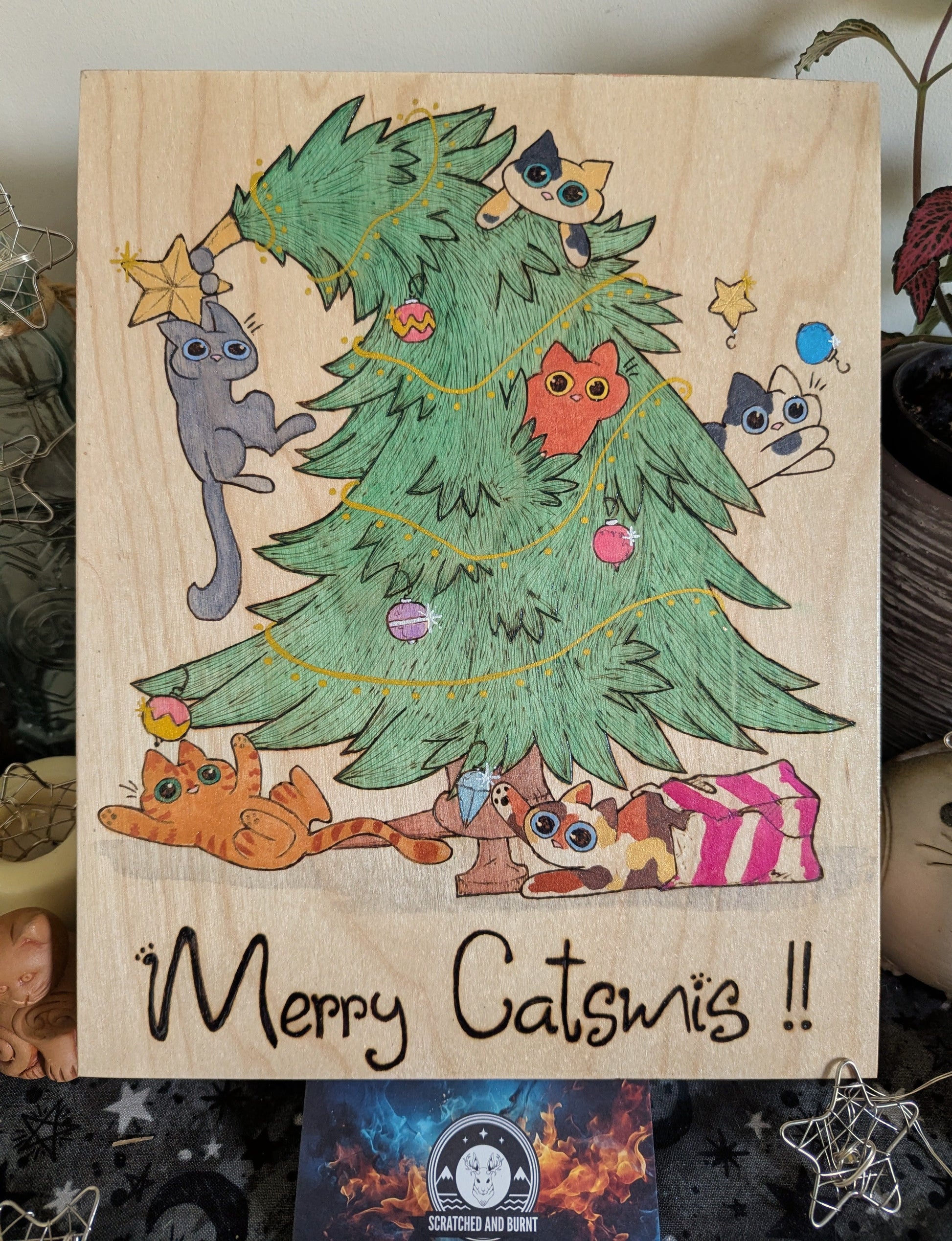 When you said you wanted your cats to get into the holiday spirit… this probably isn’t what you meant. Hand-burned and painted with watercolors, this festive piece captures the pure joy (and destruction) of cats in a Christmas tree. Finished with shiny foil edging and a cheerful “Merry Catsmis!!”