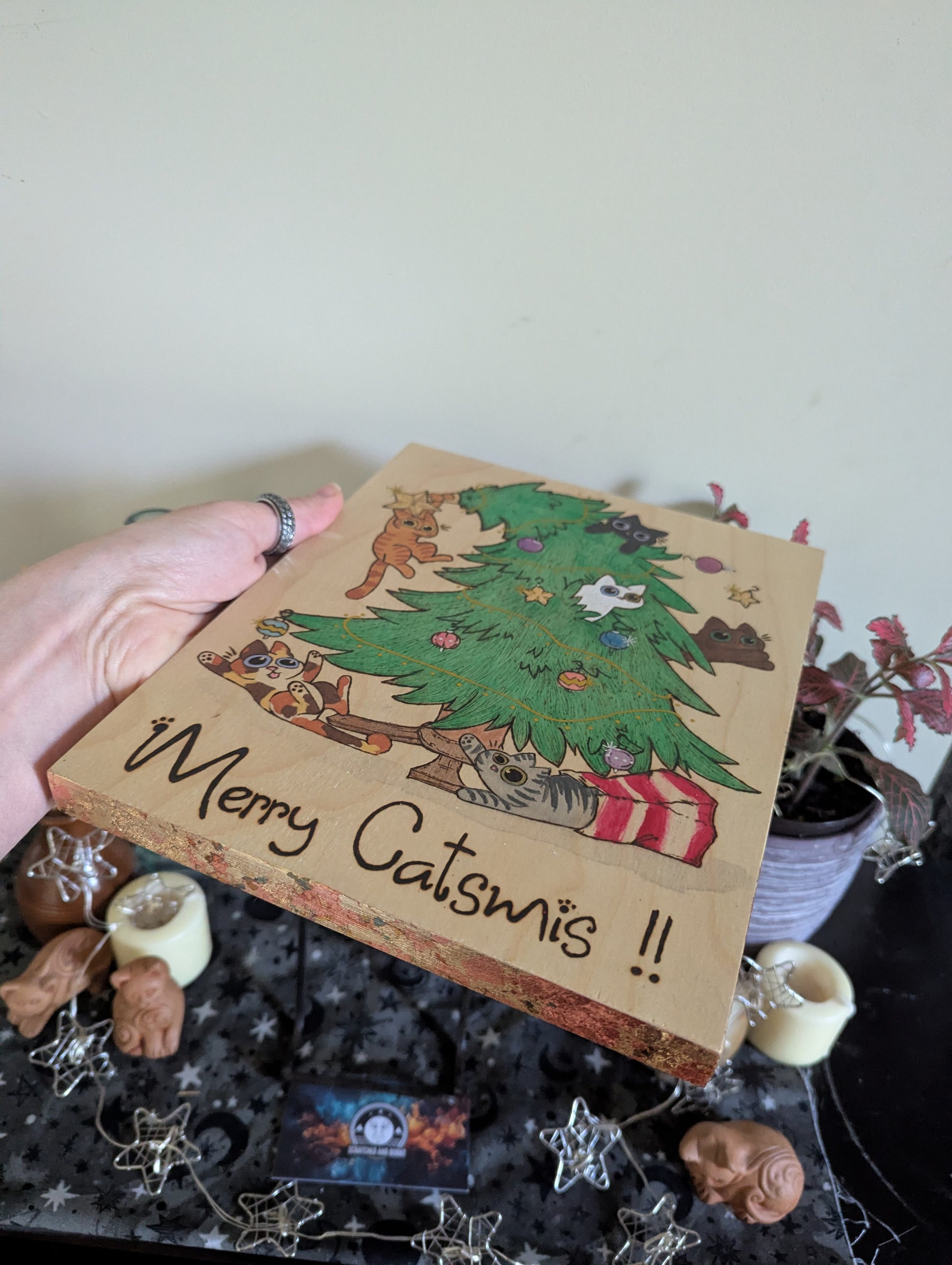 When you said you wanted your cats to get into the holiday spirit… this probably isn’t what you meant. Hand-burned and painted with watercolors, this festive piece captures the pure joy (and destruction) of cats in a Christmas tree. Finished with shiny foil edging and a cheerful “Merry Catsmis!!”