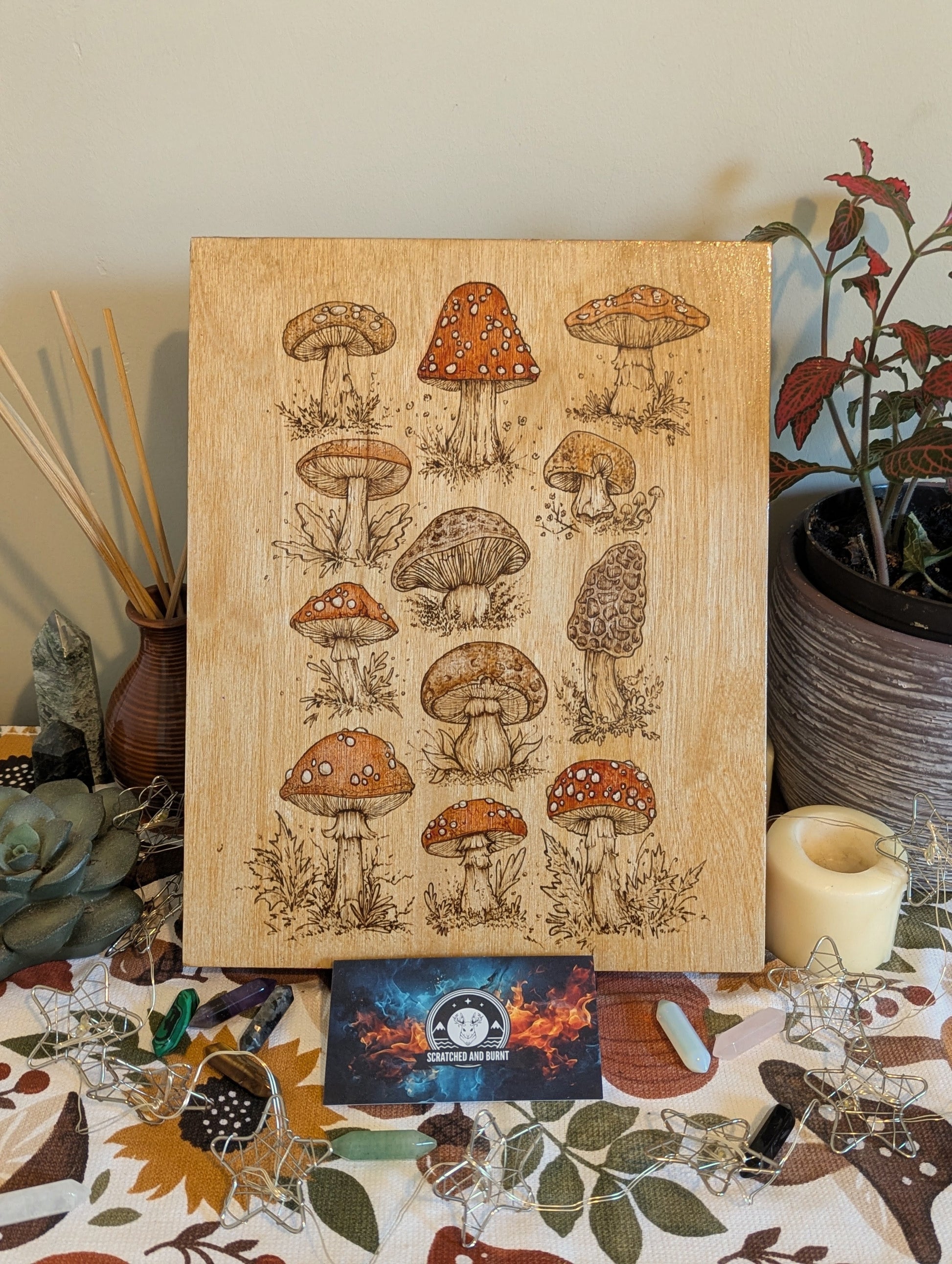 A hand-burned collection of woodland mushrooms on a wood canvas, accented with subtle colored stains and finished with a shimmering gold foil edge. A warm, earthy piece that brings a touch of forest magic indoors.