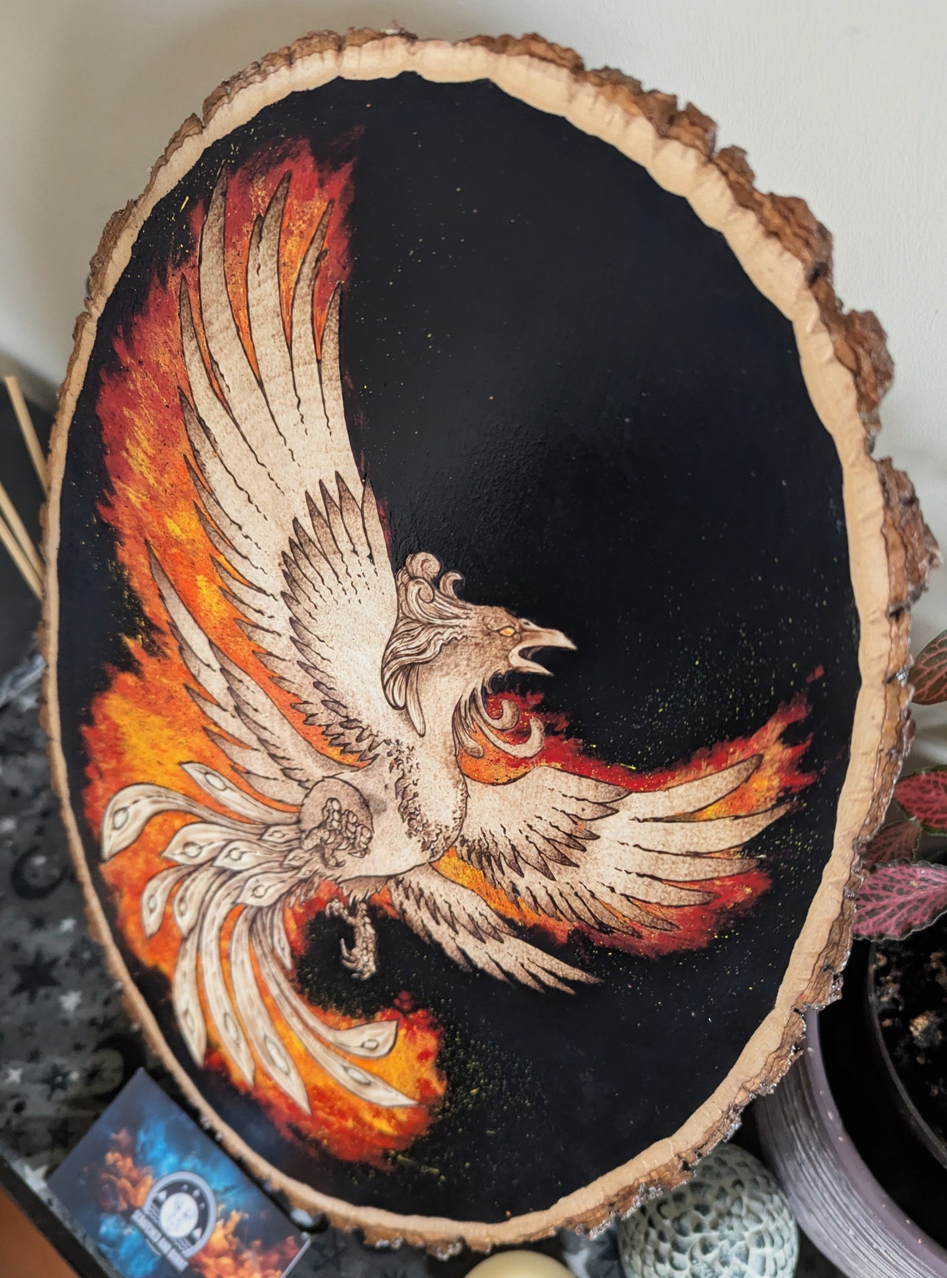 Set against a vivid, fiery acrylic-painted background, the phoenix appears to emerge from the flames, creating a bold contrast between the fine details of the phoenix and the intense reds, oranges, and yellows. The natural edges of the bark slice add an organic touch, enhancing the raw, elemental feel of the piece.
