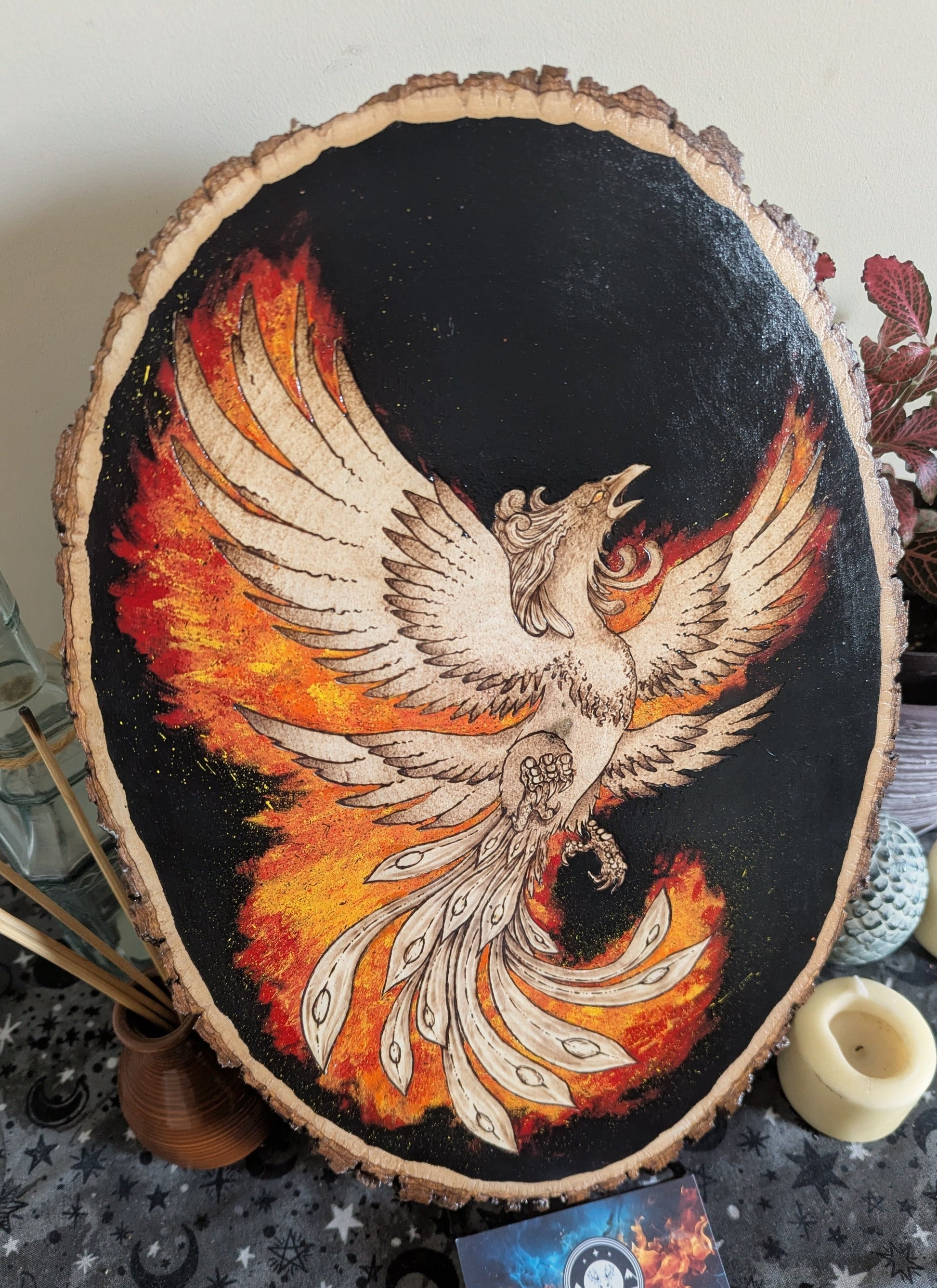 'Phoenix Rising' Pyrography with Acrylics, on Wood Desk/Wall Art, Large
