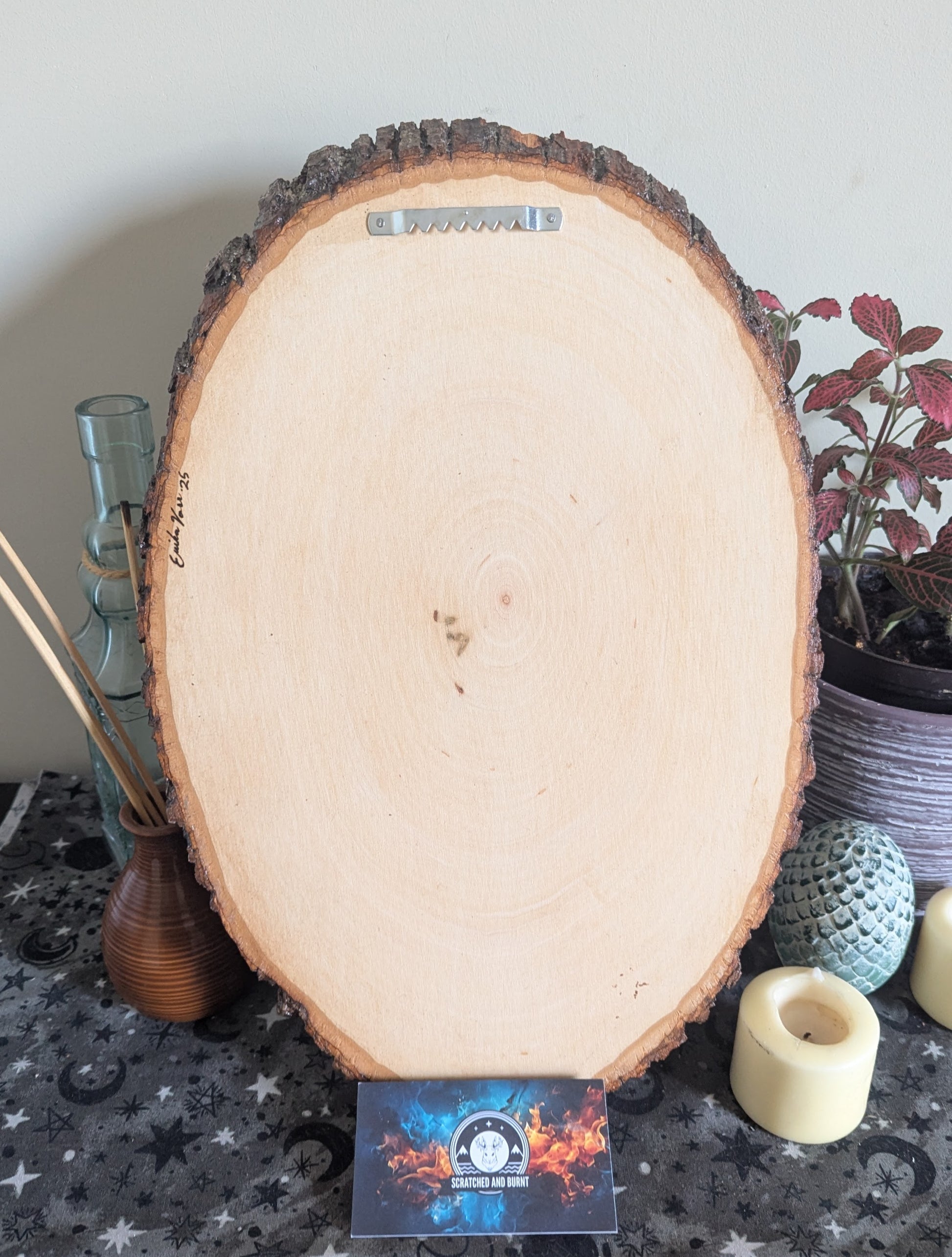 Symbolizing rebirth and strength, this striking artwork features a majestic phoenix, burned into a natural basswood bark slice. The intricate pyrography details bring the bird’s feathers to life, capturing its grace and power.